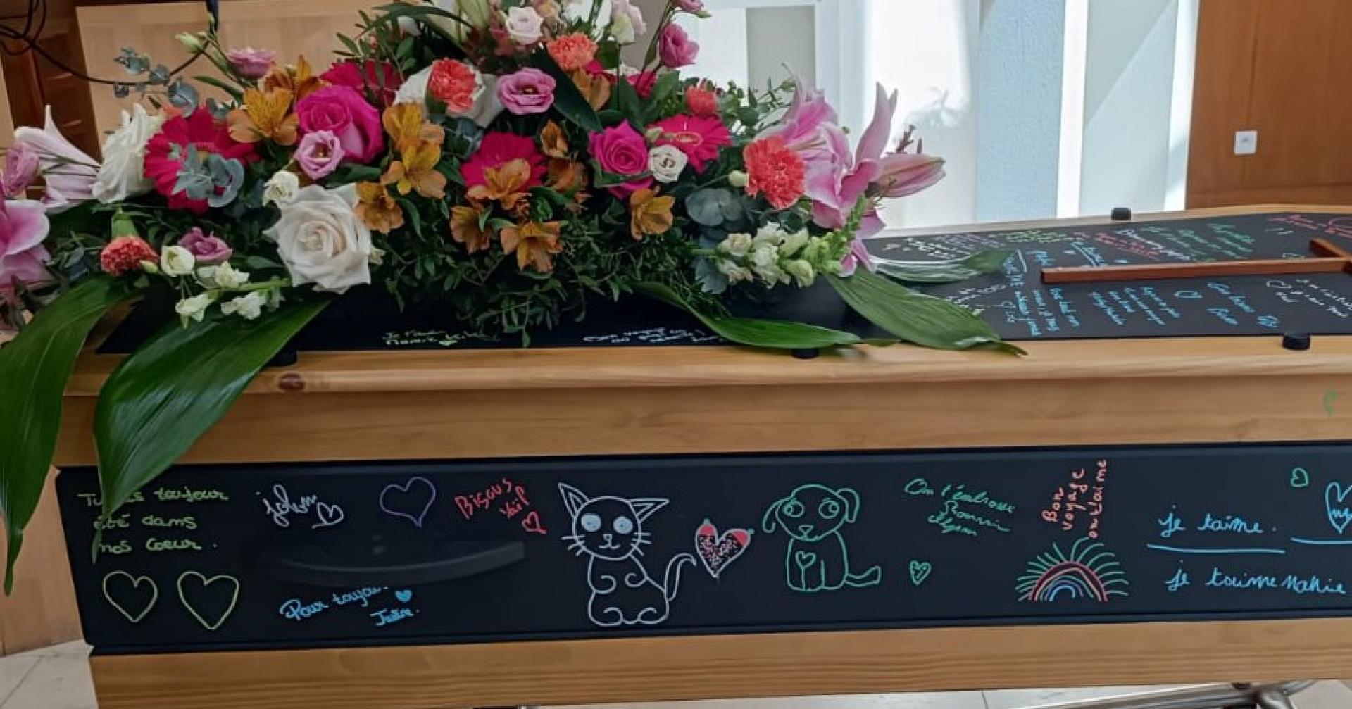 personnalisation du cercueil paraphe peinture noire effet ardoise pour écrire dessus Pompes funèbres Pinault