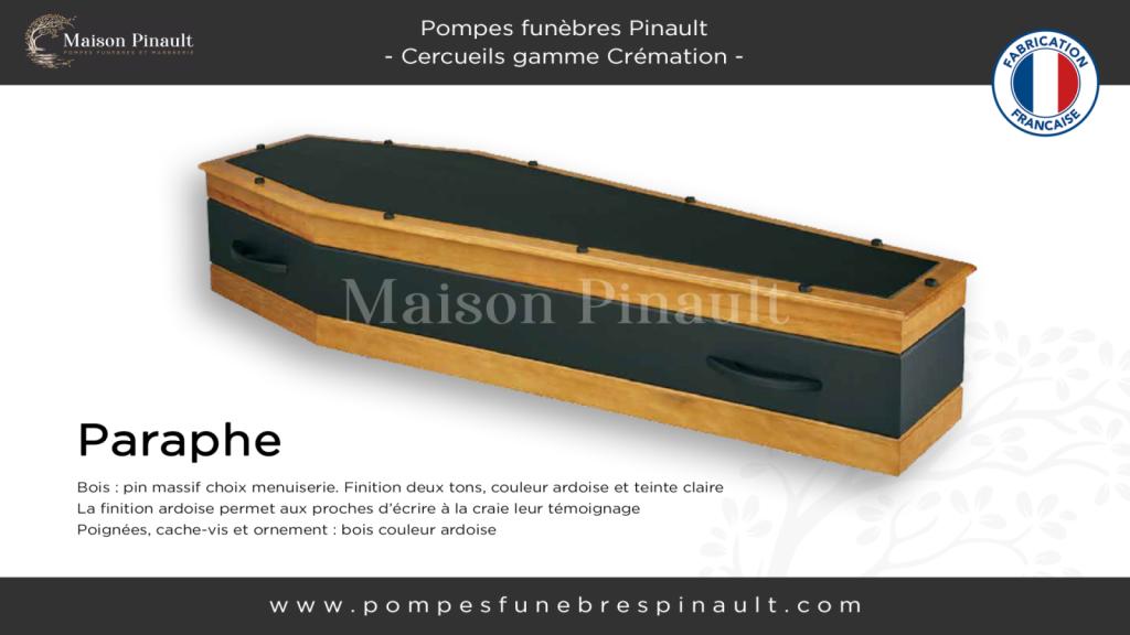 Il est possible de personnaliser le cercueil en y ajoutant un ornement en bois fixé sur le couvercle, tel qu’une croix ou une rose. Nous proposons également un modèle inédit avec finition ardoise, qui permet aux proches d’écrire à la craie un dernier message ou témoignage directement sur le cercueil.